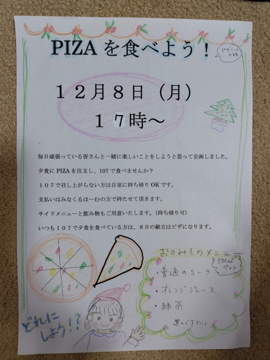 第1弾ではスタッフがスプーン曲げの手品を披露。利用者様にもやってもらうと見事成功!!そんなこともありながら久しぶりのピザをスタッフとしゃべりながら嬉しそうに召し上がっていました。
