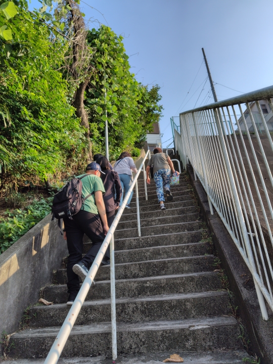 階段の一番上まで上りました。上った後は、高台からみなくるほーむの建物を確認。