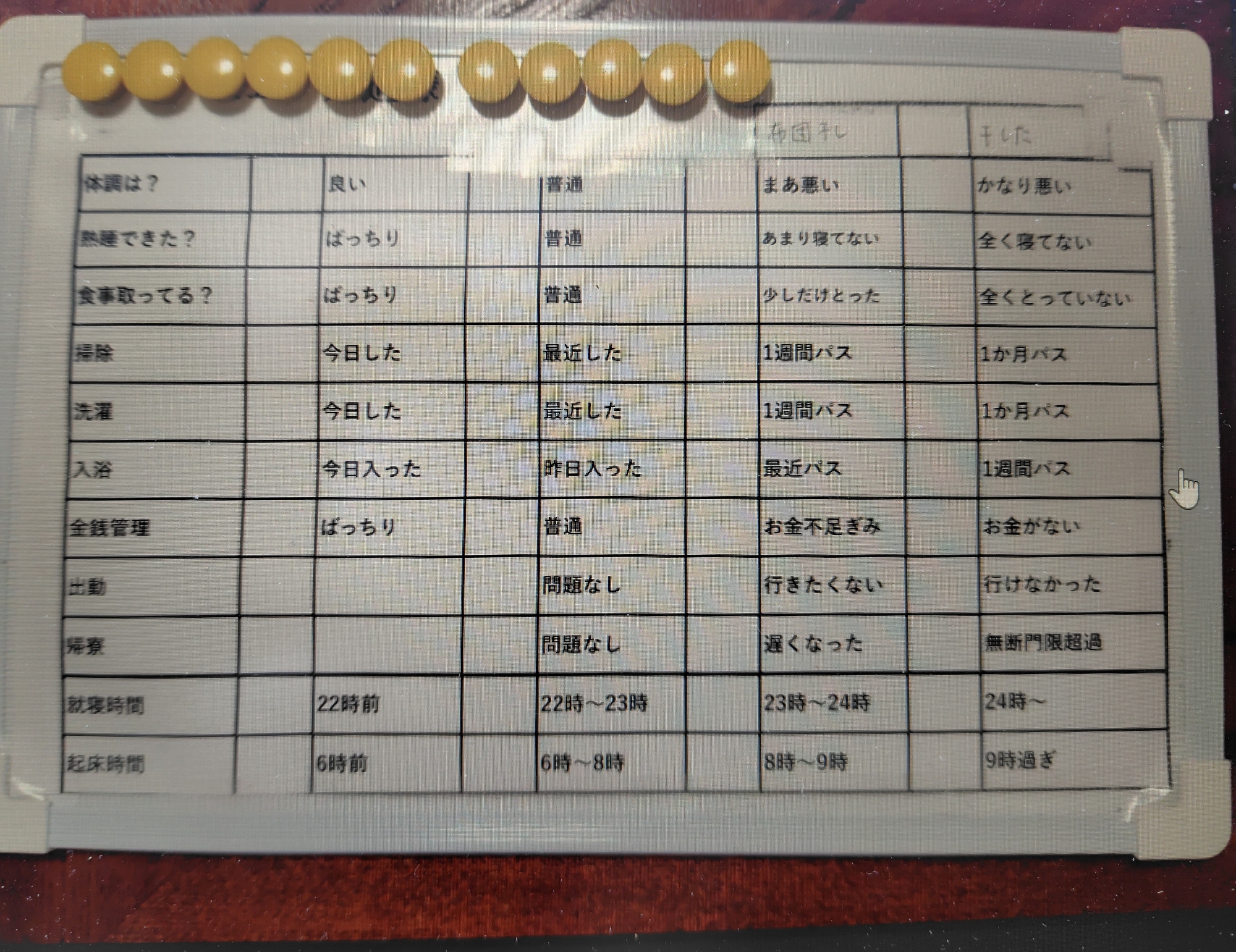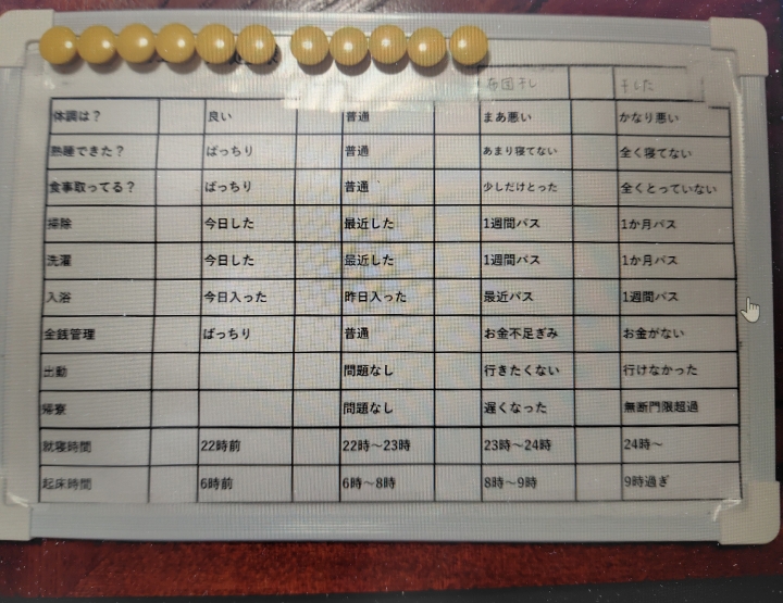 一つ一つの項目に対し、ご利用者様自身がマグネットを該当箇所につけていきます。