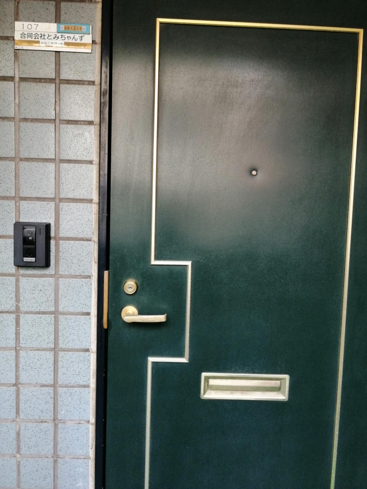みなくるほーむの事務室はエントランスから一番近い107号室です。深緑のドアの前に来ました。
